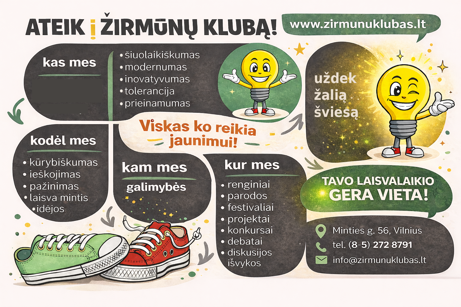 Erdvė, kurioje susitinka kūryba, judesys, muzika, idėjos ir jaunų žmonių smalsumas. Esame modernūs, atviri, kuriantys ir visada pasiruošę augti kartu su jumis.